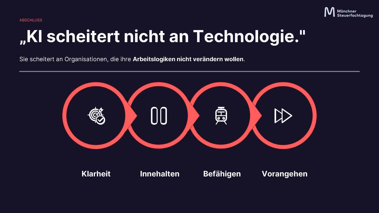 Wer zu früh mit dem Vorangehen beginnt, ohne vorher Klarheit geschaffen und die Organisation befähigt zu haben, erzeugt vor allem Aktionismus. Wer sich dagegen die Zeit nimmt, die eigene Kanzlei strukturell auf diese Entwicklung vorzubereiten, schafft die Grundlage dafür, dass KI nicht nur bei Einzelnen, sondern in der gesamten Organisation funktioniert.