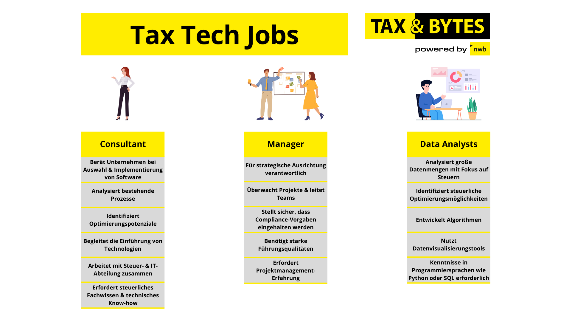 - Tax Technology Manager sind in Unternehmen für die strategische Ausrichtung der Steuertechnologie verantwortlich. Sie überwachen Projekte, leiten Teams und stellen sicher, dass Compliance-Vorgaben eingehalten werden. Manager in diesem Bereich benötigen starke Führungsqualitäten, Erfahrung im Projektmanagement und ein tiefes Verständnis der verfügbaren Technologien.