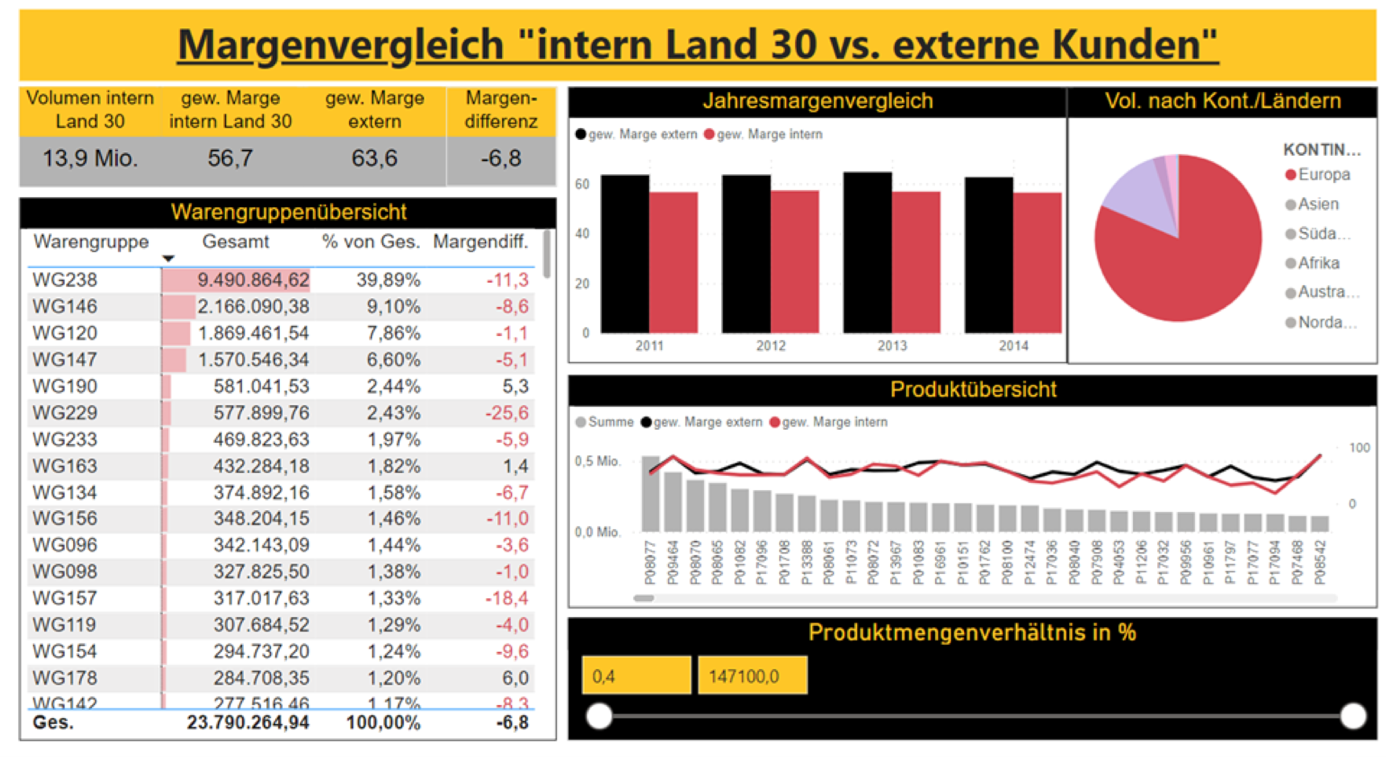 Abbildung: Beispielsfall „Margenvergleich „intern Land 30 vs. externe Kunden“, Datenverprobung mittels Power BI