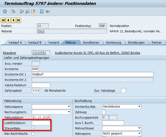 Abbildung 2: Manuelle Übersteuerung umsatzsteuerlicher Parameter in der Auftragsposition.