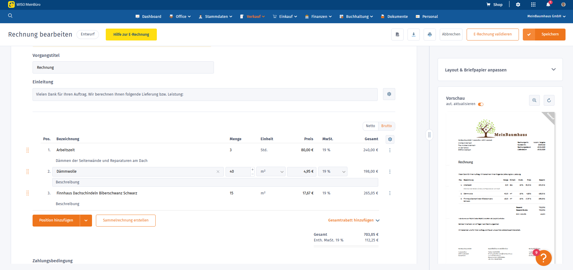 WISO MeinBüro ermöglicht das rechtssichere Erstellen und Versenden von Angeboten, Rechnungen, Auftragsbestätigungen und Lieferscheinen mit wenigen Klicks - wahlweise im Browser oder per mobiler App (iOS & Android). Pflichtangaben werden dabei automatisch ergänzt. Dank integriertem Kundenportal können Ihre Kunden versendete Angebote online einsehen und annehmen sowie Rechnungen direkt bezahlen.