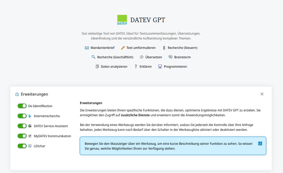 Die DATEV KI-Werkstatt stellt Prototypen bereit, die unterschiedliche Aufgaben in der Textverarbeitung, Recherche und Zusammenarbeit der Kanzlei mit Mandanten unterstützen. Der Prototyp DATEV GPT bietet grundlegende Funktionen generativer KI in einer geschützten DATEV-Umgebung und ermöglicht die Verarbeitung personenbezogener und sensibler Daten unter Einhaltung definierter Datenschutz- und Sicherheitsstandards, sofern die erforderlichen Zugriffsrechte in der Kanzlei aktiviert sind. Neben der Text- und Wissensverarbeitung kann DATEV GPT über eine angebundene Internetrecherche auf aktuelle Informationen zugreifen. Die Integration fachspezifischer Erweiterungen ermöglicht zusätzliche Arbeitsabläufe, darunter z. B. LEXchat, MyDATEV Kommunikation oder der DATEV Service-Assistent.