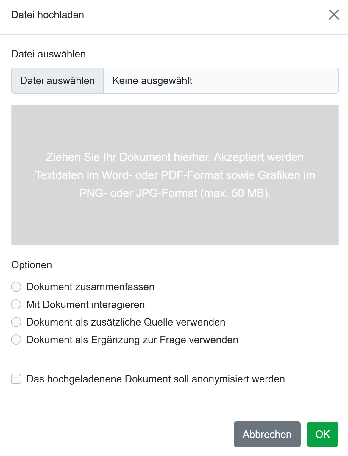Eigene Dokumente können hochgeladen und in die Analyse einbezogen werden.