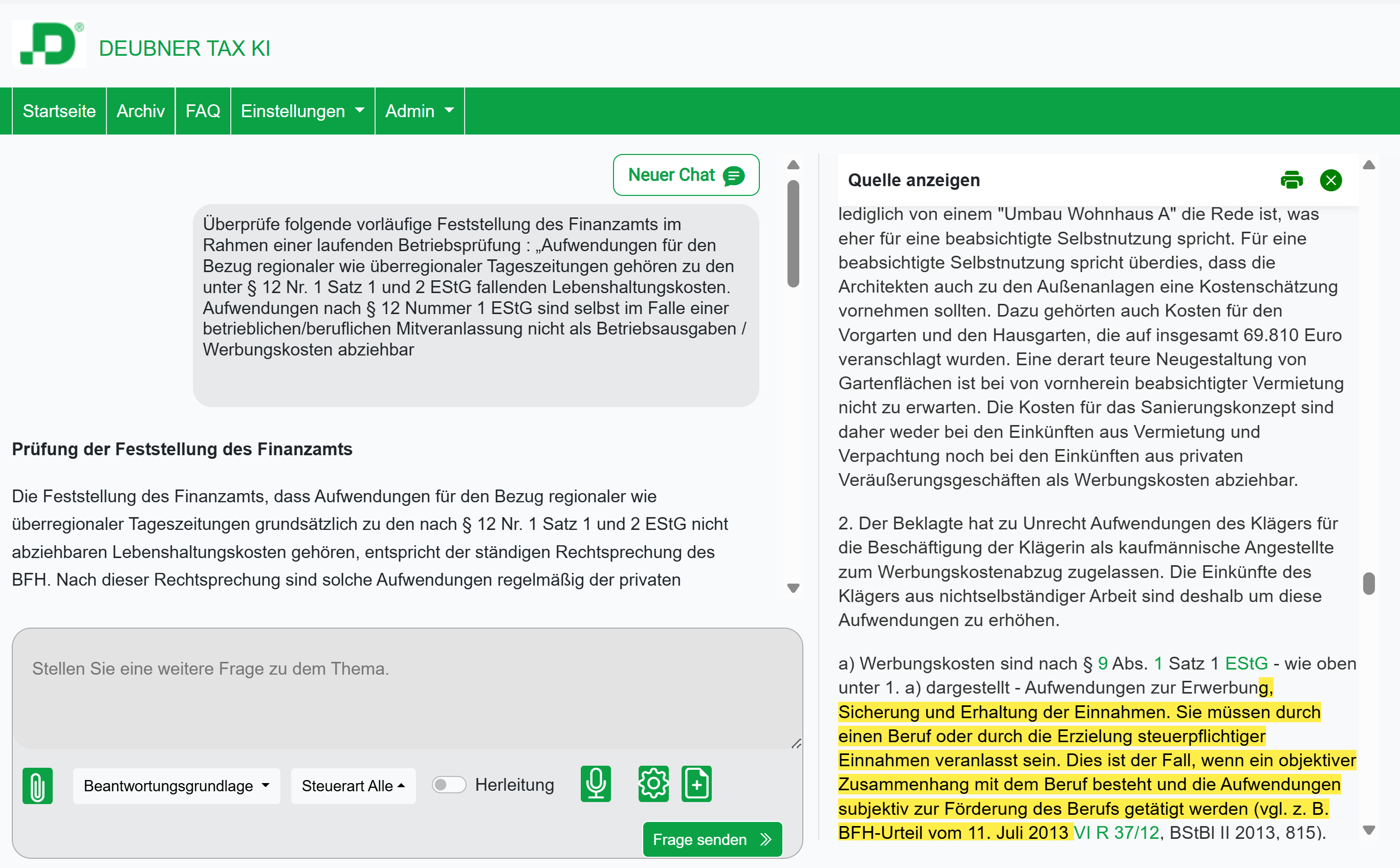 Deubner Tax KI ist eine KI-Anwendung zur Beantwortung steuerrechtlicher Fachfragen. Sie basiert auf der Deubner Expertisen-Datenbank mit über 50.000 Dokumenten sowie zusätzlichen Primärquellen wie Verwaltungsanweisungen und Gesetzestexten. Die Lösung steht als separates Angebot zur Verfügung und wird vollständig in Deutschland gehostet.