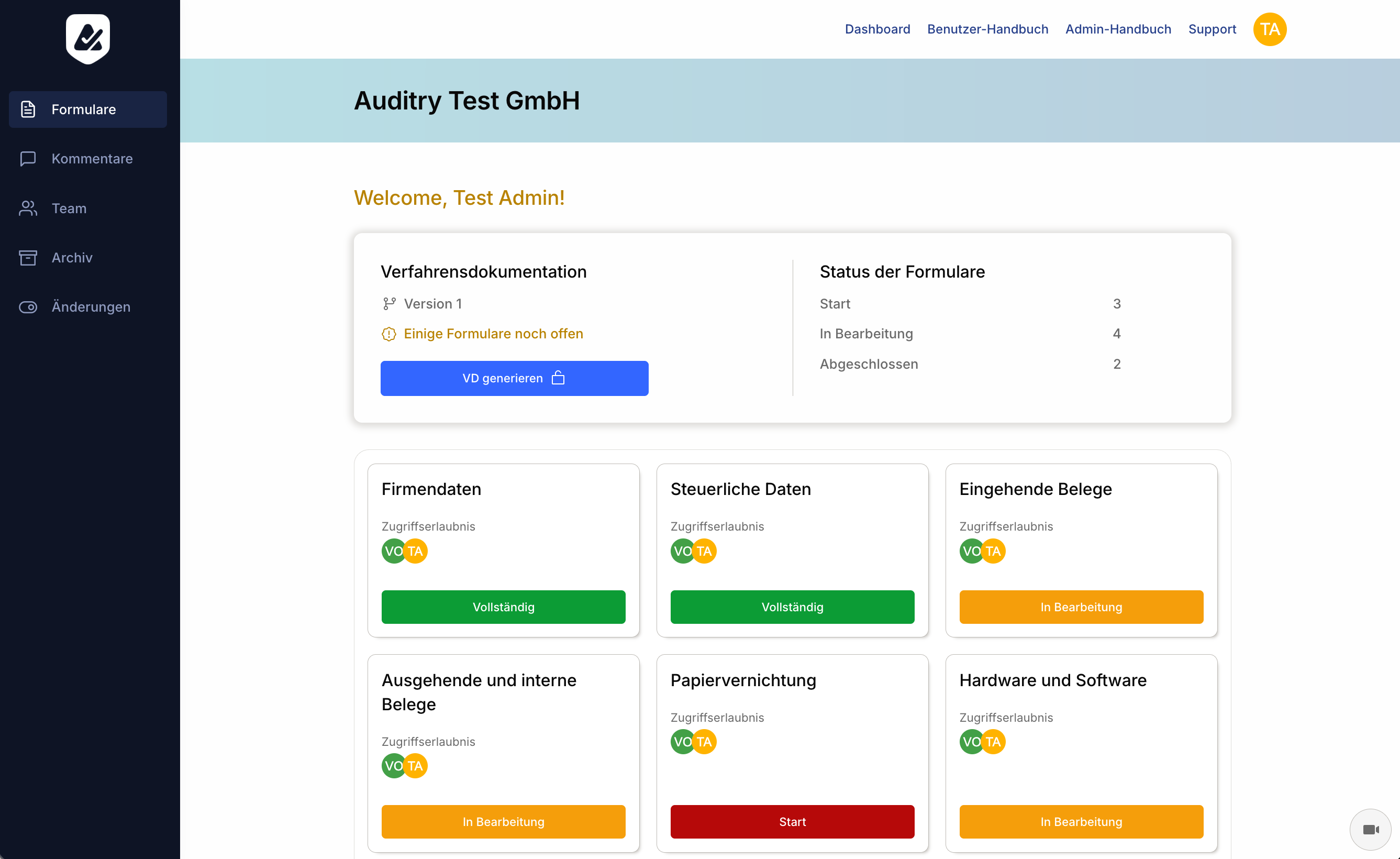 Auditry führt Nutzer mittels Chatbot durch die Dokumentation der steuerlich relevanten Prozesse und erstellt daraus automatisch eine Verfahrensdokumentation nach den Vorgaben der GoBD. Gemäß den internen Richtlinien wird die Revisionssicherheit durch ein internes Kontrollsystem gewährleistet, das alle Änderungen lückenlos protokolliert und eine regelmäßige Aktualisierung sicherstellt. Für Unternehmen jeder Größe bietet Auditry eine digitale Unterstützung zur rechtssicheren, nachvollziehbaren und aktuellen Dokumentation ihrer Geschäftsprozesse.
